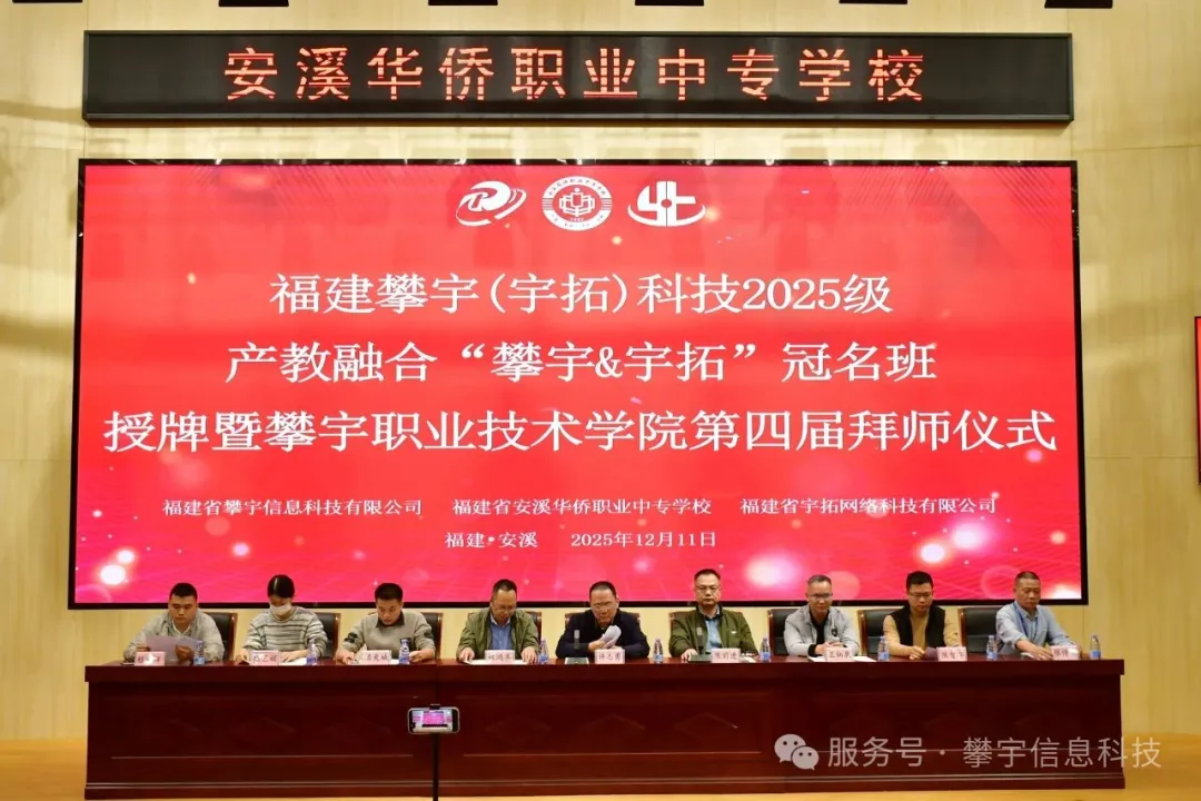 攀宇&宇拓冠名班授牌暨攀家学院第四届拜师仪式我司隆重举行2025级校企合作校园里的攀宇,攀蟾折桂。校园里的攀宇,宇量深广。12月11日下午,公司在安溪华侨职校隆重举行2025级校企合作“攀宇&宇拓”冠名班授牌暨攀宇职业技术学院第四届拜师仪式。公司陈前进董事长、安溪华侨职校许志勇书记、林鸿齐副校长,安溪华侨职校教务处、物联网技术与智能应用教学部以及公司校企合作部的全体师生参加了仪式。仪式在一段精彩的公司宣传视频中拉开帷幕,视频展示了福建攀宇科技和安溪华侨职校五年来校企合作,产教融合过程中在人才培养、技术创新、专业建设等各项工作中取得的丰硕成果,让在场的每一位师生加深了对公司的了解,展示了公司的实力及产品优势。仪式上,公司陈前进董事长做开场致辞,表达了对攀家学子的殷殷期盼,回顾了五年校企合作取得的喜人成果,进一步明确了新学年的奋斗目标;他用:“忠诚、吃苦、坚持、守纪”八个字对加入攀宇团队的新学员寄予了希望,表示将继续深耕细作:“星星”、“壮苗”和“沃土”三个计划;同时,希望每个学员都要设立短期、中期、长期实训目标,做到自省、自律、自爱,要心怀星辰大海,主动奔跑,坚持心中那份对技术和未来的热爱。仪式上,安溪华侨职校副校长林鸿齐讲话,他勉励大家,“人生在勤,不索何获”,要心中有梦,在工作中勇于创新,踏实肯干,获得企业认可和社会尊重,为学校争光添彩;同时也要服从企业的安排,踏实去做好每一个岗位职责,祝福学子们在学习工作中人人努力成才,人人皆可成才,人人尽展其才。希望学员们有信心、有总结、有目标的同时也要懂得珍惜来之不易的机会,懂得感恩,好好规划未来的学习计划。仪式上,公司陈前进董事长、安溪华侨职校许志勇书记、林鸿齐副校长共同为2025级“攀宇产教融合班”、“宇拓产教融合班”和“攀宇产教融合创新班”颁发匾额。三个冠名班运营设立标志着双方合作进入新阶段,公司将继续通过“校中企,企中校”的模式,让学生在校期间就能接触行业前沿科技,掌握实用技能。拜师礼成,庄重温暖。在“师者,传道授业解惑也”的传统理念指引下,公司导师陈文灿、刘雅洳先后上台,徒弟代表依次上前,以三鞠躬礼表达敬意:一谢师傅辛勤指导,二愿勤奋共创佳绩,三誓携手共谱新篇。师徒互赠礼物的瞬间,传递的不仅是情谊,更是技能传承的责任与信念。导师代表陈文灿表态将“倾囊相授,匠心育人”,学员代表上官品正承诺“尊师重道,勤学苦练”。仪式上,许志勇书记总结讲话中强调,校企合作是职业教育高质量发展的关键路径,双方应继续深化合作,培育更多适应产业发展需求的应用型人才。他特别指出,此次合作不仅是技能的传授,更是工匠精神的传承,对培养学生的专业自信和行业自信具有重要意义。他要求产教融合班的学员要:心怀感恩,回馈社会,感恩学校的培养,感恩企业的提携,更要感恩这个时代给予我们的无限可能。仪式最后,2025级产教融合冠名班的全体师生集体合影留念,定格这一难忘美好时刻。此次拜师仪式既是产教融合的生动实践,更是匠心传承的重要载体,标志着福建攀宇科技和安溪华侨职的合作迈入新阶段,将为区域经济产业发展培养更多高素质应用型技术技能人才。攀宇产教融合创新班(2025级网站班)攀宇产教融合班(2025级网络1班)宇拓产教融合班(2025级网络2班)END 来源 | 福建攀宇科技 编辑 | 刘雅洳 审核 | 综合部 声明 | 本文章版权归福建攀宇科技所有,转载请注明出处福建攀宇科技匠心攀宇,暖心服务攀蟾折桂,宇量深广我坚信,分享、收藏、在看、点赞是不耍流氓的鼓励!